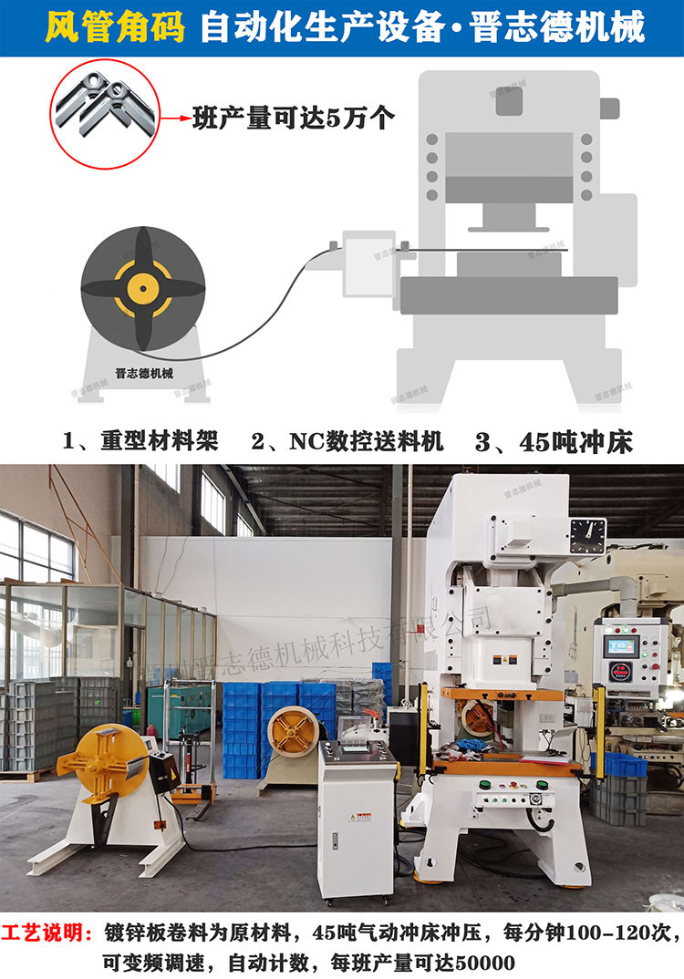 風管角碼生產線使用鍍鋅板卷料為原材料,45噸氣動沖床沖壓,每分鐘100-120次,可變頻調速,自動計數,每班產量可達5萬,適用于風管角碼、共板法蘭角碼的全自動高速生產。