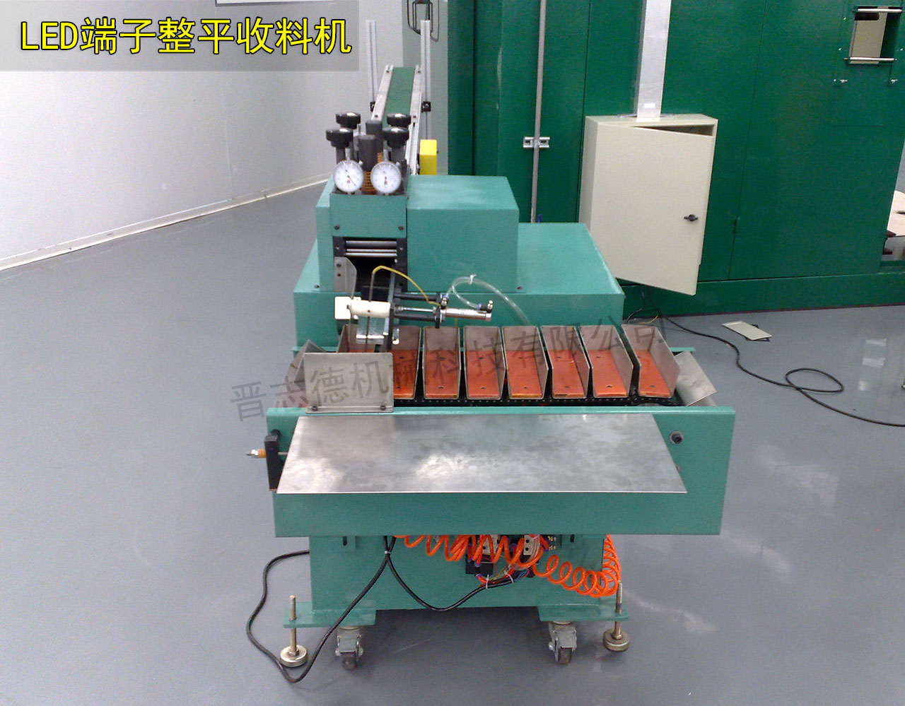 晉志德LED端子整平收料機由輸送帶、整平裝置、收料裝置三部分組成,由連續模所沖制的略彎端子、半導體、LED、電晶體等電子元件類的支架經由輸送帶輸送進入整平機的上下滾壓輪間,經整平后的電子元件類支架再由收料裝置予以計數收料、堆疊,堆疊一定數目后可自動移送以供取出,整平收料速度能達30片/min,大了滿足了端子廠整平收料之需求。