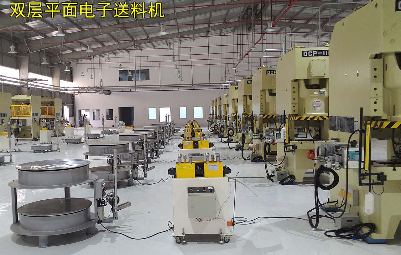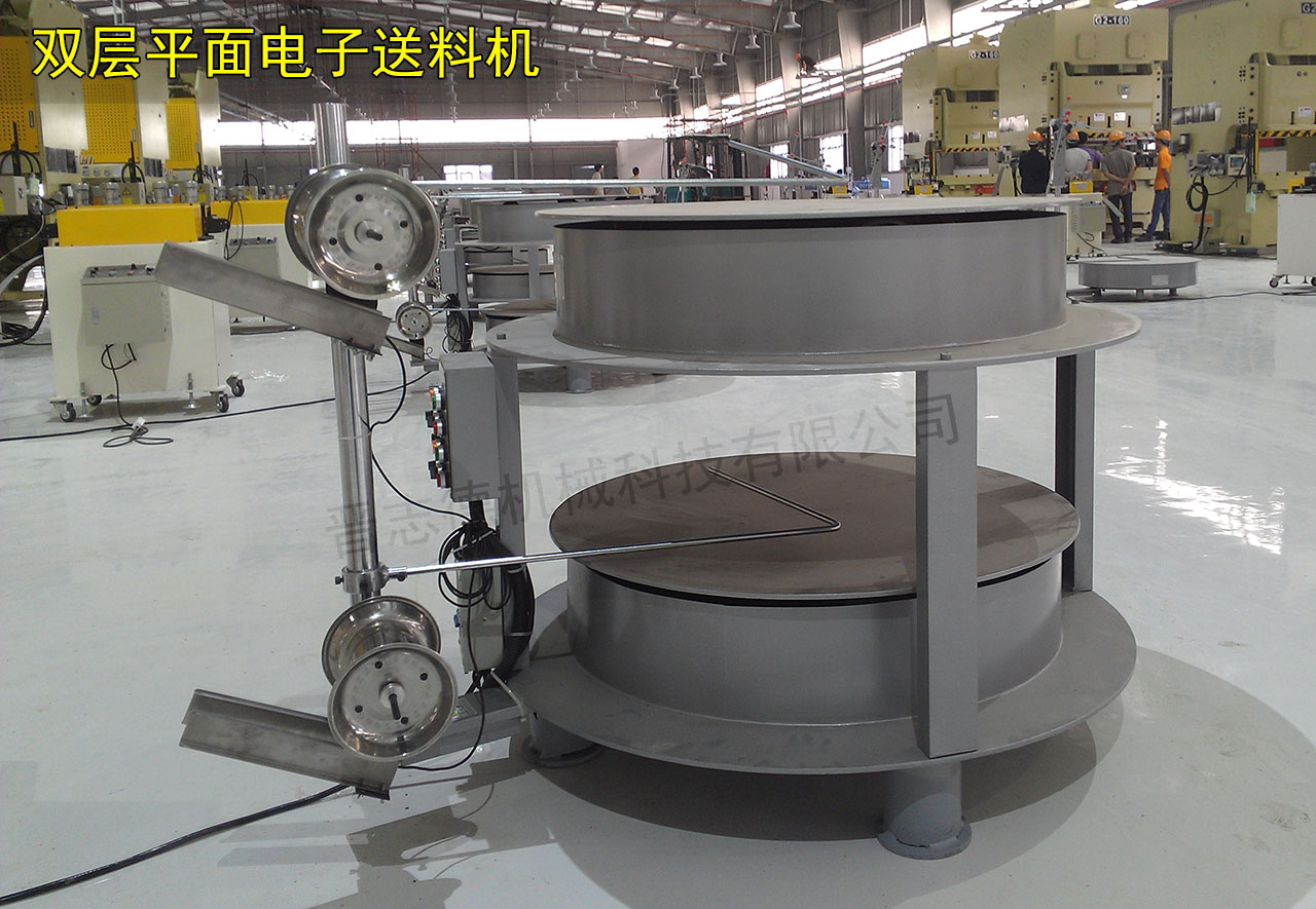 為了滿足沖壓客戶生產(chǎn)之需求,晉志德機械在傳統(tǒng)臥式材料架(平面電子送料機)基礎上研發(fā)生產(chǎn)出了一種能同時開卷兩條料帶的臥式材料架,即雙層平面電子送料機。