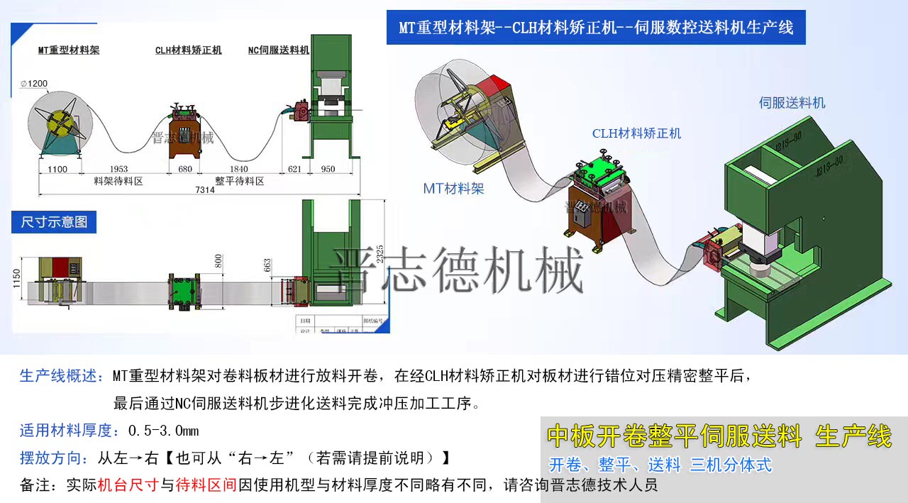 1、材料矯正機適用于0.5-3.0mm厚的中板材料整平,整平滾輪為¢60mm,上3下4排列方式,可用于各五金廠、電子廠沖壓件的連續(xù)生產(chǎn)。